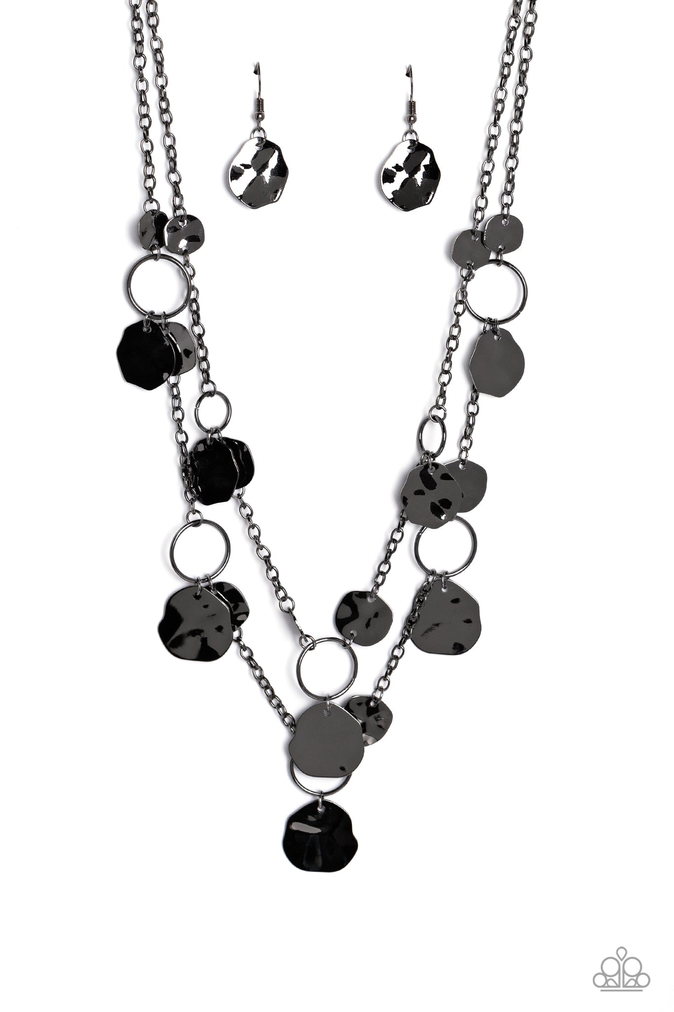 Infused along a double-stranded gunmetal chain, smooth gunmetal hoops and abstract, hammered gunmetal discs fall down the neckline for an edgy, boisterous display. Features an adjustable clasp closure.