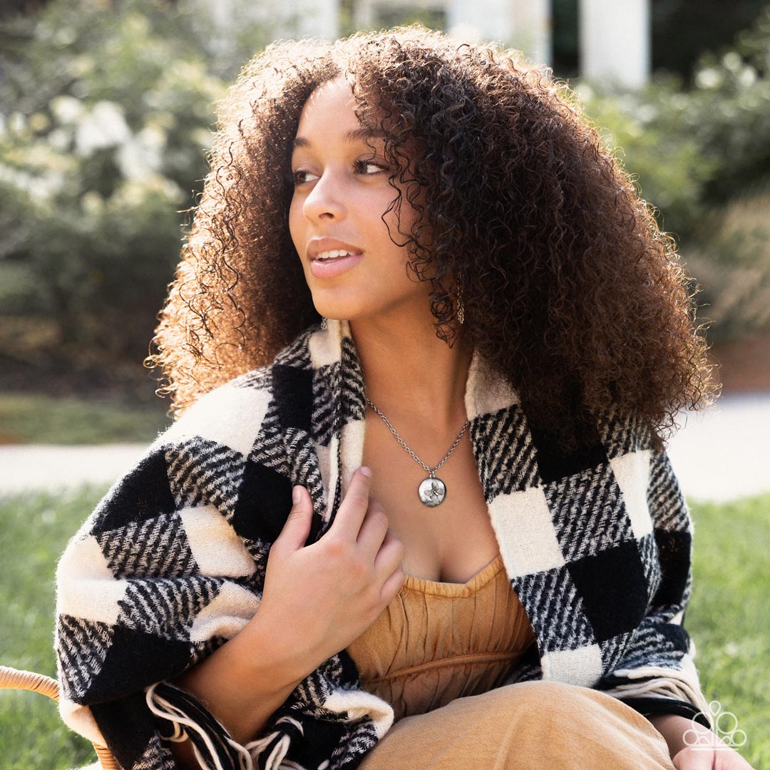 A dainty silver butterfly flutters atop a beveled silver disc, resulting in a whimsical pendant at the bottom of a classic silver chain. Features an adjustable clasp closure.