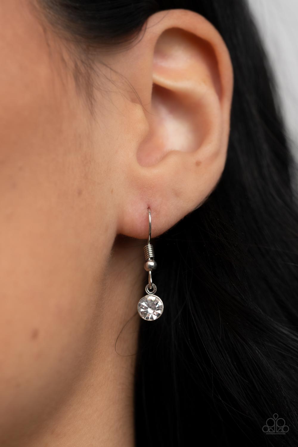 A white rhinestone encrusted silver frame is flanked between two silver discs scratched in a glistening shimmer as they drip from an ornately double-linked silver chain down the chest. A lobster clasp hangs from the bottom of the design to allow a name badge or other item to be attached. Features an adjustable clasp closure.